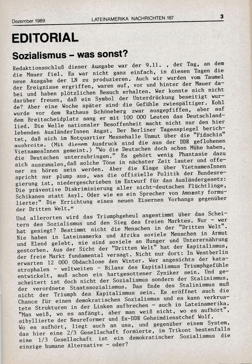 Editorial Sozialismus – was sonst? N°187 de Lateinamerika Nachrichten, diciembre 1989